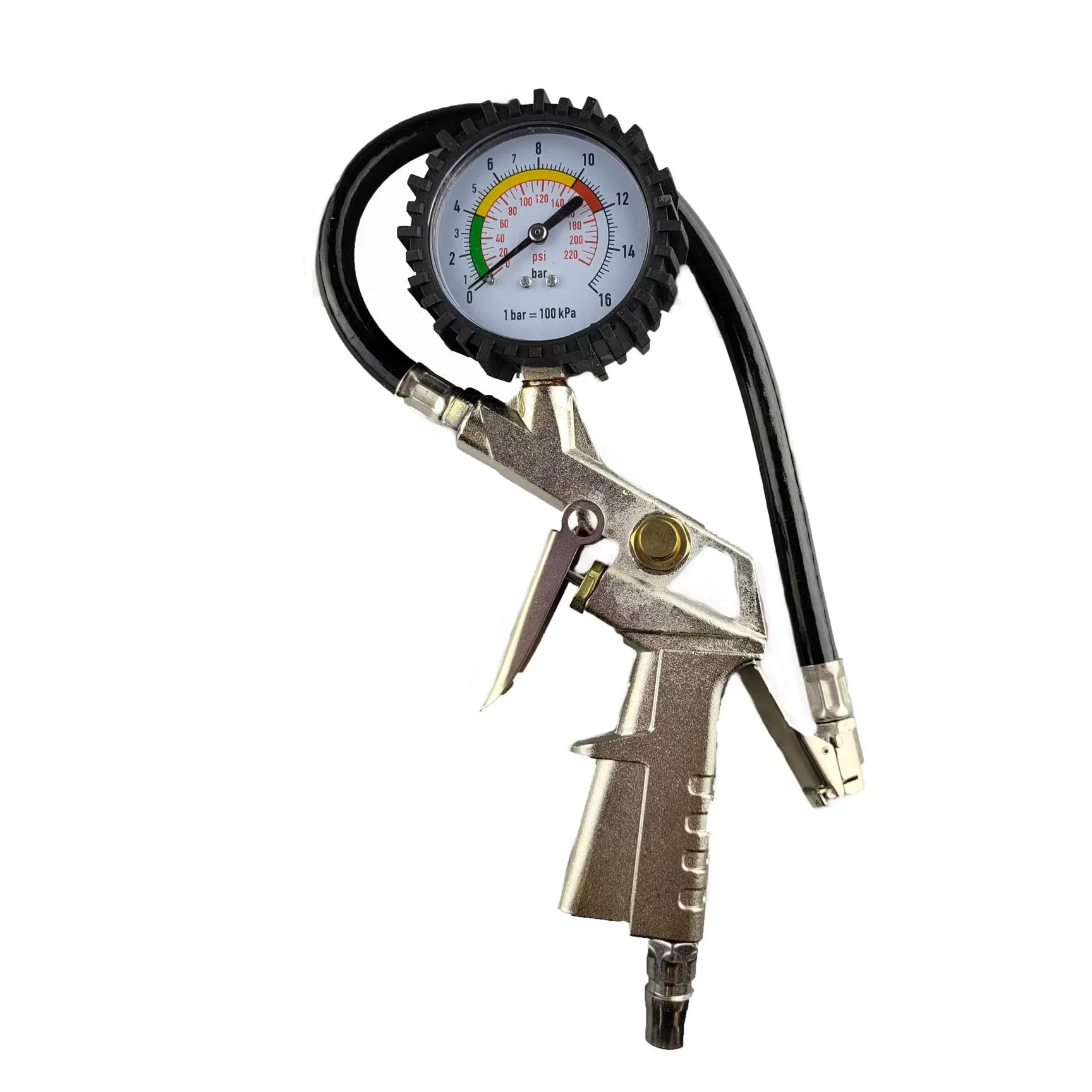 Пистолет с манометром предназначен для измерения давления и подкачки шин. Пневматический пистолет оснащен кнопкой стравливания воздуха и манометром с двойной шкалой, что дает возможность контролировать давление в шинах во время подкачки. Гибкий шланг 36,5 см позволяет производить работы в узких и труднодоступных местах. Легкий алюминиевый корпус прорезинен. Шланг 15 атмосфер и соединение типа рапид созданы для быстрого и удобного подключения.