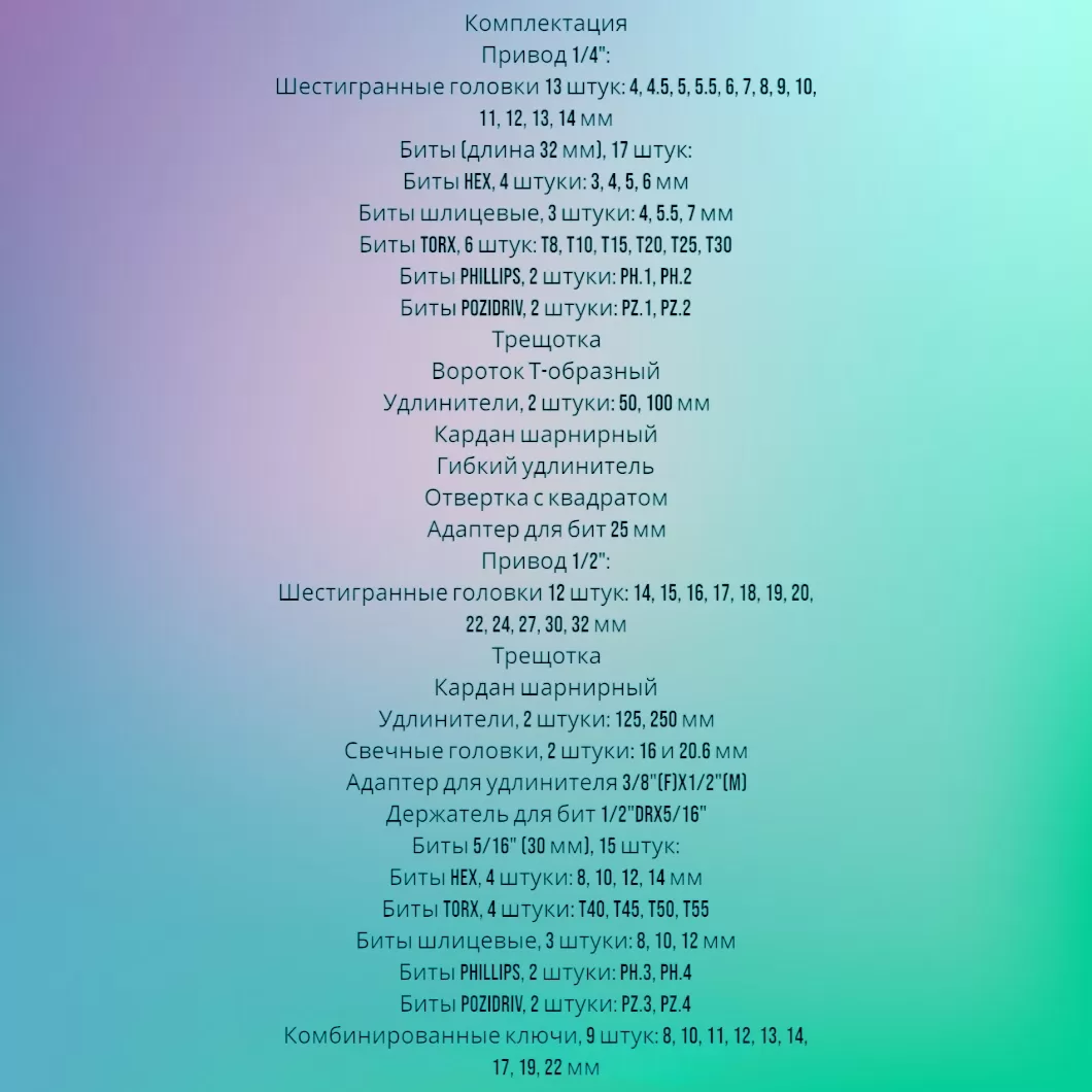 Универсальный набор инструментов с 12-гр. головками 1/2"DR и 1/4"DR используется в автомастерских для работ с различными видами крепежа. Набор состоит из 82 предметов, на каждом из которых стоит маркировка с размером. Набор выполнен из высокопрочной стали, на поверхность инструментов нанесено хромованадиевое покрытие, которое придает изделиям высокую коррозионную стойкость и механическую прочность. Для надежного хвата и комфортной работы ключи-трещотки оснащены удобными двухкомпонентными рукоятками. Набор инструментов для авто поставляется в кейсе из ударопрочного пластика, что гарантирует безопасное хранение и транспортировку. Инструменты внутри кейса компактно расположены и надежно закреплены. Специальная застежка предотвращает выпадение инструментов из кейса. Комплектация набора представлена на фото 4.